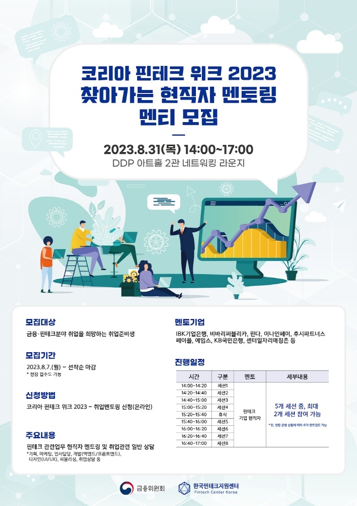 코리아 핀테크 위크 2023 內「핀테크 서포트존」입장은 무료로 진행되며 박람회 기간(8월 30일~9월 1일) 동안 상설 부스 형태로 운영된다. 상기 프로그램 중 ‘핀테크 현직자 멘토링’은 오는 30일 수요일까지 사전등록 후 참여가 가능하다.