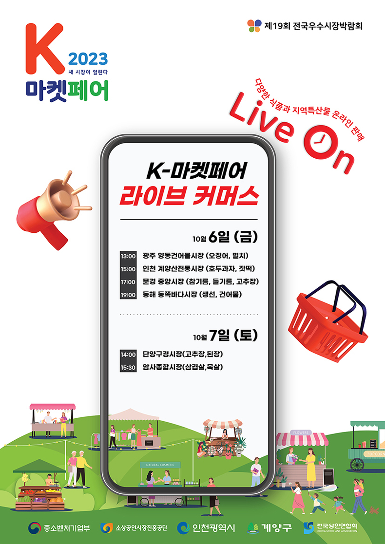 1일 차인 5일에는 청년상인요리경연대회가 펼쳐지며, 6일부터 ‘K-MARKET FIAR 라이브커머스’, 신바람콘서트, 우리시장뽐내기와 버스킹 공연, 경품 이벤트, 체험 프로그램 등이 진행된다.