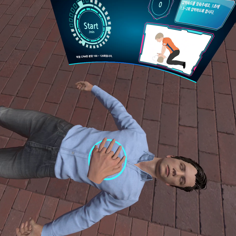 ‘메타버스 AI 심폐소생술 체험교육 VR’의 경우 시간과 장소에 제약 없이 반복적인 학습이 가능하며, 특히 심폐소생술 학습을 지도할 인력과 교보재인 애니(Annie)인형 및 AED 훈련키트 없이도 진행이 가능하다는 점에서 물리적인 제약에서도 벗어날 수 있다는 것이 강점이다.