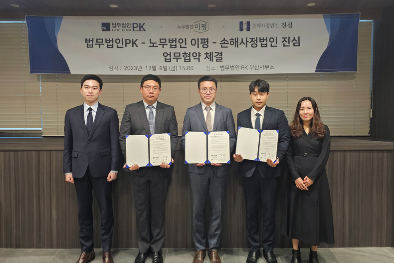 [라온신문 장슬기 기자] 법무법인 PK와 노무법인 이평, 손해사정법인 진심이 지난 9일 법무법인PK 부산 본사무소에서 법률, 노무, 손해사정 관련 서비스 제공 강화를 위한 업무협약(MOU)을 체결했다고 14일 밝혔다.