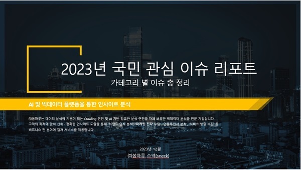 [라온신문 장슬기 기자] AI 및 빅데이터 분석 플랫폼 전문 기업인 ㈜봄마루(대표 신명섭)는 2023년도 정치, 경제 등 카테고리별 국민 관심 이슈 리포트를 발행했다.