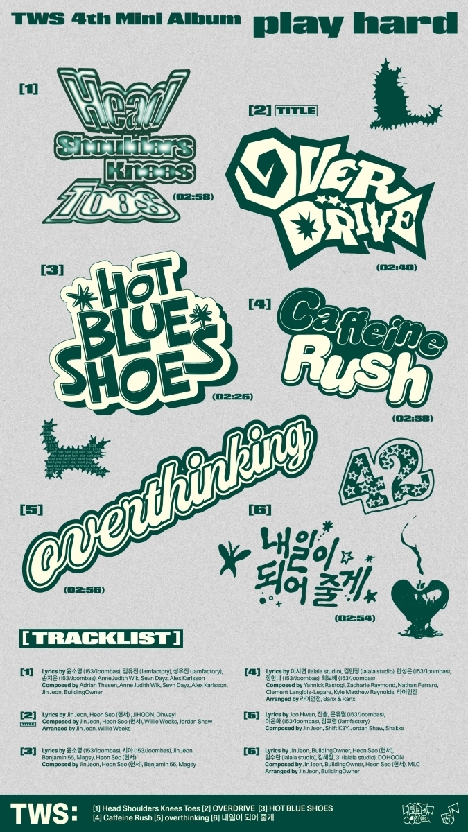 이에 따르면 신보에는 타이틀곡 ‘OVERDRIVE’와 지난달 22일 선공개된 ‘Head Shoulders Knees Toes’를 비롯해 수록곡 ‘HOT BLUE SHOES’, ‘Caffeine Rush’, ‘overthinking’, ‘내일이 되어 줄게’ 총 6곡이 실린다.