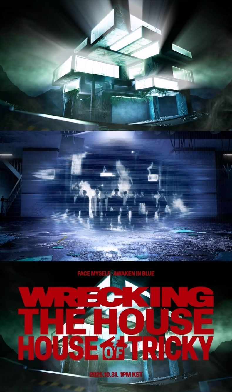 끝으로 "페이스 마이셀프, 어웨이큰 인 블루(FACE MYSELF, AWAKEN IN BLUE)"라는 문구와 더불어 앨범명인 '하우스 오브 트리키 : 레킹 더 하우스', 발매일시인 '2025.10.31', '1PM' 등이 화면을 가득 채웠다.
