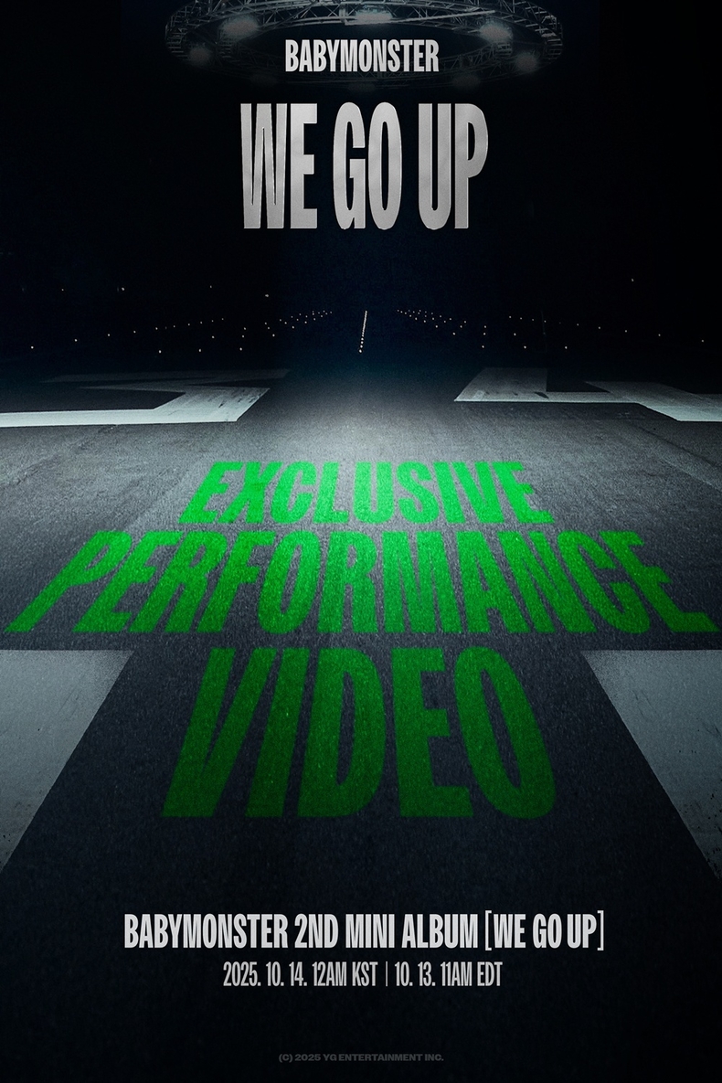 이날 업로드된 'WE GO UP' EXCLUSIVE PERFORMANCE VIDEO D-1' 포스터도 음악 팬들의 기대감을 한껏 끌어올렸다. 어두운 밤 어둠이 깔린 광활한 활주로, 그 위를 비추는 조명이 압도적 스케일을 통해 최초로 베일을 벗을 베이비몬스터의 'WE GO UP' 퍼포먼스를 예감케 한다.