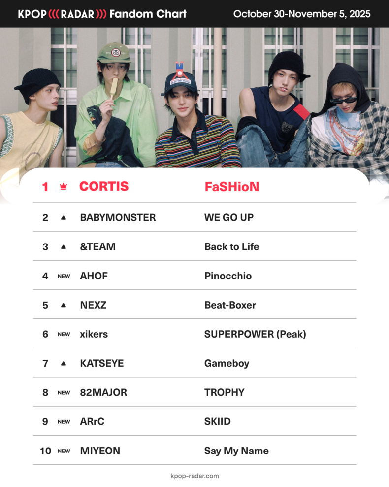 이번 주 케이팝레이더가 발표한 위클리 팬덤 차트 TOP 10에는 코르티스의 뒤를 이어 베이비몬스터 ‘위 고 업(WE GO UP)’이 2위, 앤팀 ‘백 투 라이프(Back to Life)’가 3를 기록했다. 또한 아홉, 싸이커스, 82메이저, 아크, 미연 등이 순위에 새롭게 이름을 올렸다.