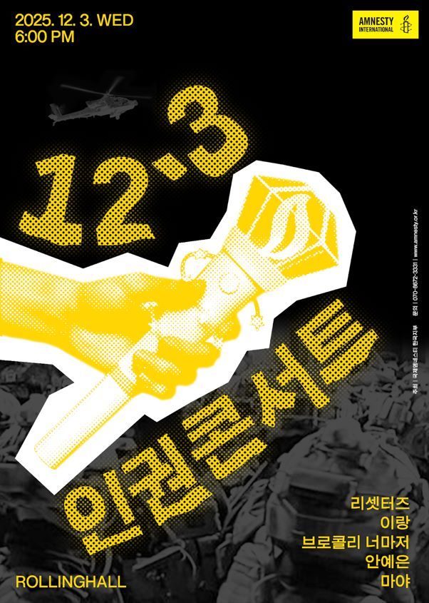 국제엠네스티한국지부가 롤링홀에서 오는 12월 3일 오후 6시에 마야, 안예은, 브로콜리너마저, 이랑, 리셋터즈 등이 출연하는 12.3 인권콘서트를 개최한다.