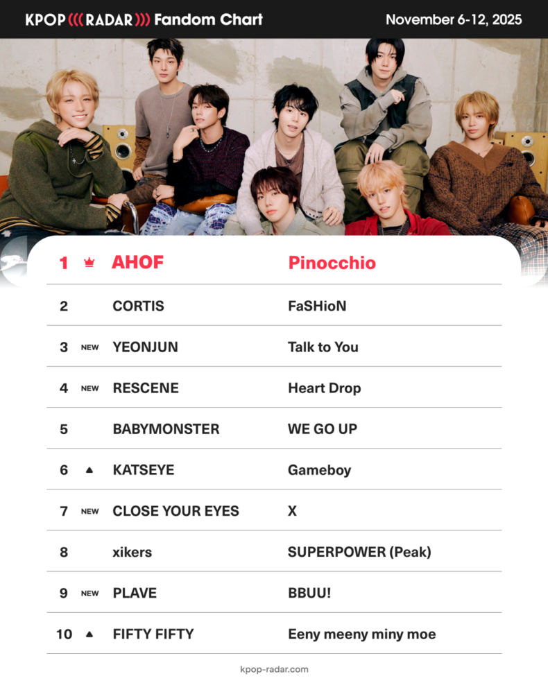 이번 주 케이팝레이더 위클리 팬덤 차트 TOP 10에는 아홉에 이어 코르티스의 ‘패션(FaSHioN)’과 연준의 ‘톡 투 유(Talk to You)’가 2~3위에 새롭게 진입했다.