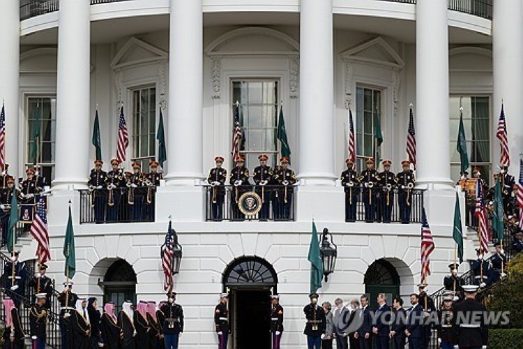 이날 오전 백악관 사우스론에서 열린 환영식에선 의장대가 도열하고 군악대가 연주하는 가운데 트럼프 대통령이 직접 빈 살만 왕세자를 맞이했다. 두 사람은 미군 전투기가 백악관 상공에서 환영비행을 하는 모습을 함께 지켜봤다.