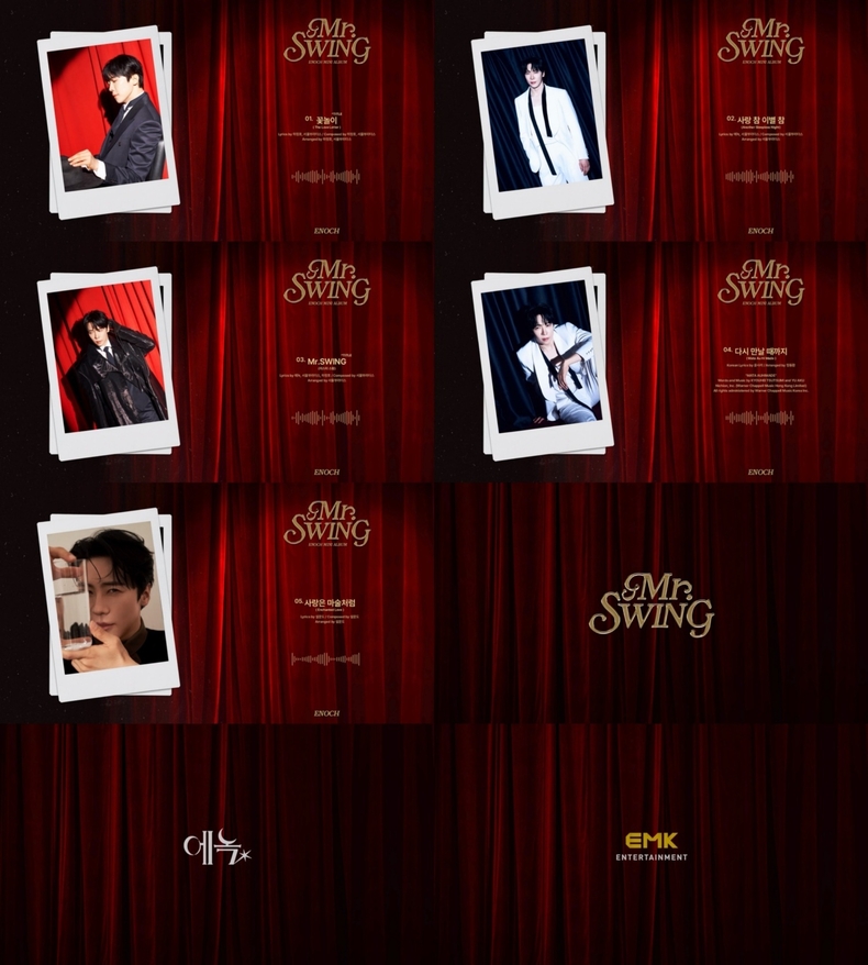 소속사 EMK엔터테인먼트는 지난 21일 공식 채널을 통해 에녹의 새 미니 앨범 ‘Mr. SWING’의 하이라이트 메들리를 공개했다. ‘Mr. SWING’은 ‘SWING(스윙)’이라는 키워드처럼, 인생의 리듬 속에서 웃고 울며 타인과 관계를 맺고, 때로는 이끌고 때로는 이끌리며 흔들리는 인간의 감정을 음악으로 담아낸 앨범이자, ‘에녹 브랜드’의 방향성이 담긴 신보다.