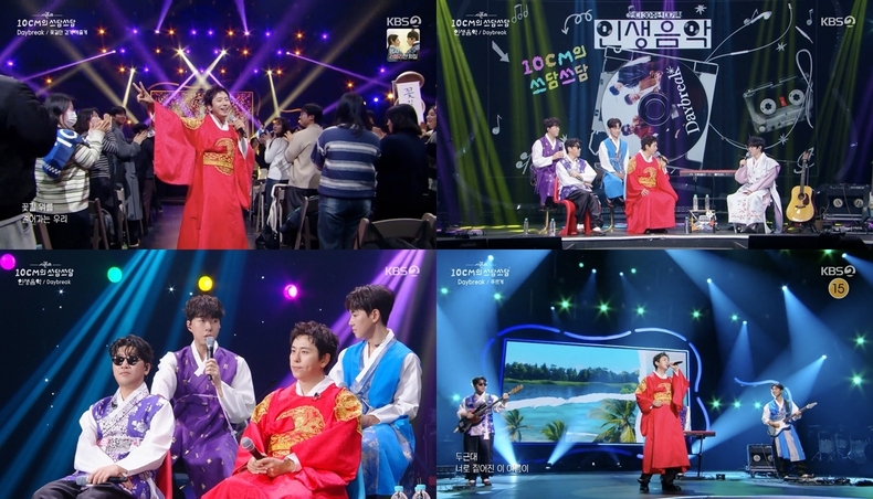 데이브레이크(이원석, 김선일, 김장원, 정유종)는 지난 2일 방송된 KBS2 뮤직 토크쇼 '더 시즌즈-10CM의 쓰담쓰담'의 '인디 30주년 대기획–인생 음악'에 출연, 곤룡포 한복을 차려입고 등장해 시선을 사로잡았다. 보컬 이원석은 "짐이 노래를 하는데 앉아 있을 것이냐"하고 재치 있게 외치며, 관객들을 일으켜 세워 현장 분위기를 끌어올렸다.