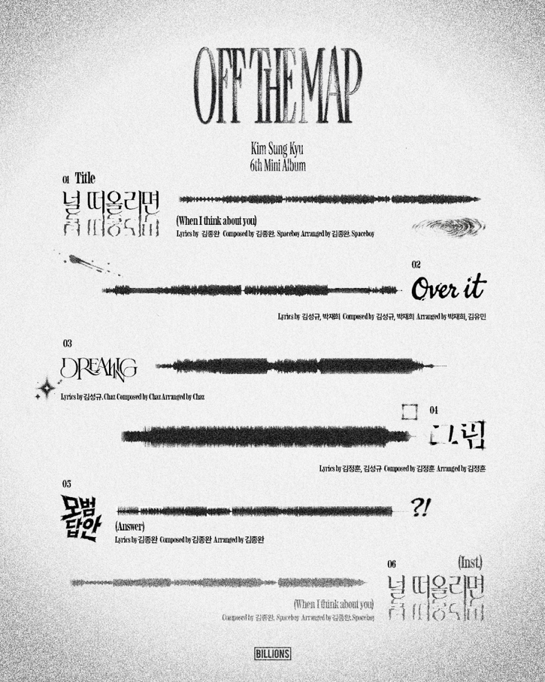 소속사 빌리언스는 20일 공식 SNS를 통해 김성규의 미니 6집 '오프 더 맵(OFF THE MAP)' 트랙리스트와 앨범 샘플러 풀버전을 공개했다.