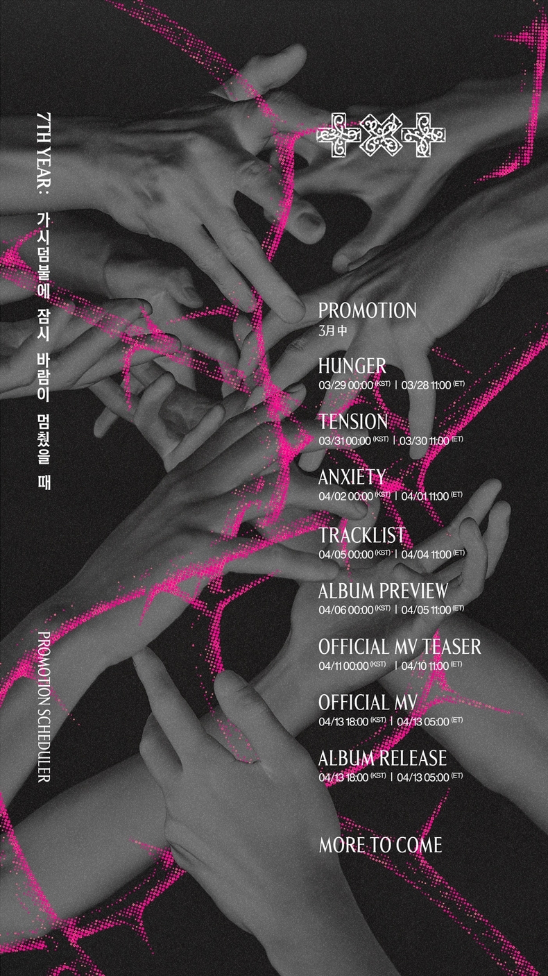 투모로우바이투게더(수빈, 연준, 범규, 태현, 휴닝카이)는 5일 팀 공식 SNS에 미니 8집 ‘7TH YEAR: 가시덤불에 잠시 바람이 멈췄을 때’ 프로모션 스케줄러를 공개했다. 흑백 톤의 이미지 속 뒤엉킨 멤버들의 손 사이로 형광빛 가시덤불이 뻗어 나간다. 대비를 이루는 색감과 가시를 시각화 한 상징적인 오브제가 어우러져 강렬한 인상을 남긴다.