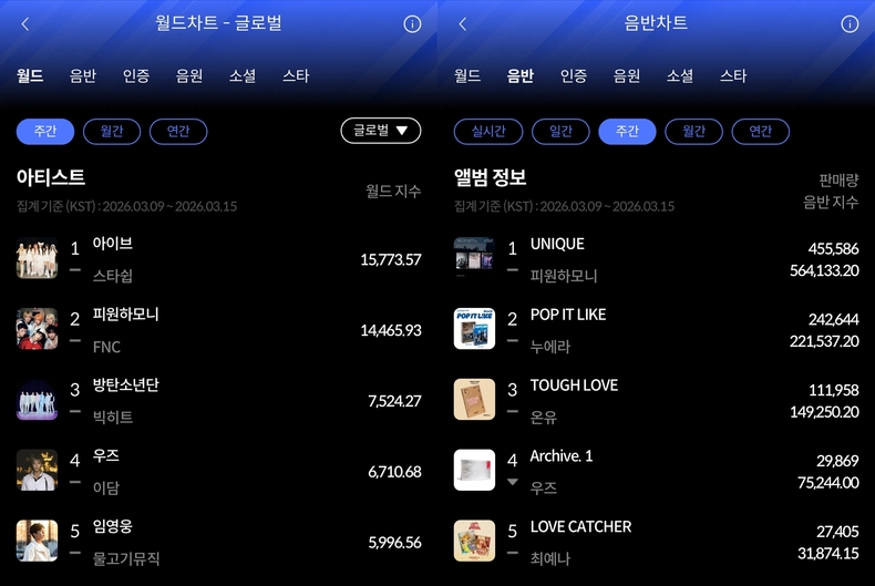 실시간 음악차트인 한터차트가 16일 발표한 2026년 3월 2주 차 주간차트에 따르면, 아이브와 피원하모니가 한터차트 3월 2주 차 월드차트와 음반차트에서 각각 1위에 올랐다.