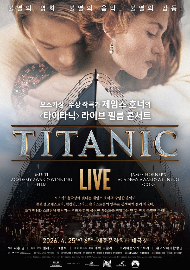 18일 아트앤아티스트에 따르면, ‘타이타닉’이 오는 4월 25일 세종문화회관 대극장에서 ‘타이타닉 라이브 필름 콘서트’로 한국 관객을 찾는다. 이번 공연은 아카데미 11관왕의 대작 ‘타이타닉’ 속 제임스 호너의 오리지널 스코어를 영상에 맞춰 실시간으로 재현하는 것이 특징이다. 대형 스크린의 압도적인 영상미와 120인조 규모의 오케스트라 및 합창단의 실황은 관객들에게 감동적인 체험의 장을 선사할 것으로 보인다.