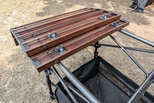 상판에는 흠집방지 코팅을 해 스크래치와 오염 없이 사용을 할 수 있고, 철제 프레임은 습기와 부식에 강해 캠핑하면서 외부 환경에 노출이 돼도 오래 사용이 가능하며 어떠한 지형에서도 안전하게 사용할 수 있는 미끄럼방지 풋 커버를 적용, 하단에는 수납 메쉬망을 통해 물건을 손쉽게 수납 및 보관할 수 있도록 했다.