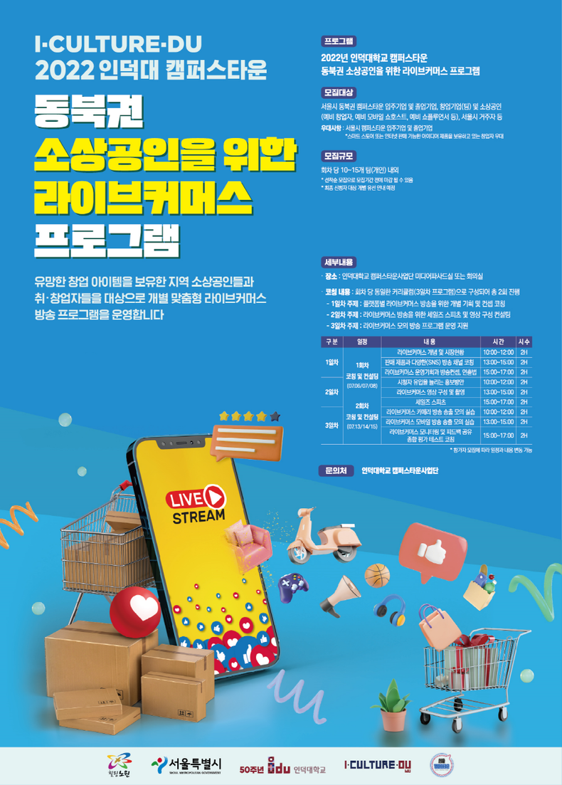 이상봉 인덕대학교 캠퍼스사업단장은 “이번 동북권 라이브커머스 프로그램이 지역 소상공인들의 다양한 판로개척과 온라인 비즈니스 마케팅 역량을 강화하는데 있어서 큰 도움이 됐을 것이다”라며 “앞으로도 지역 소상공인은 물론 입주기업의 성장과 발전에 좋은 영향력을 끼칠 수 있는 프로그램 개발 및 지원을 통해 성공적인 캠퍼스타운 밸리 조성이 될 수 있도록 노력하겠다”고 밝혔다.