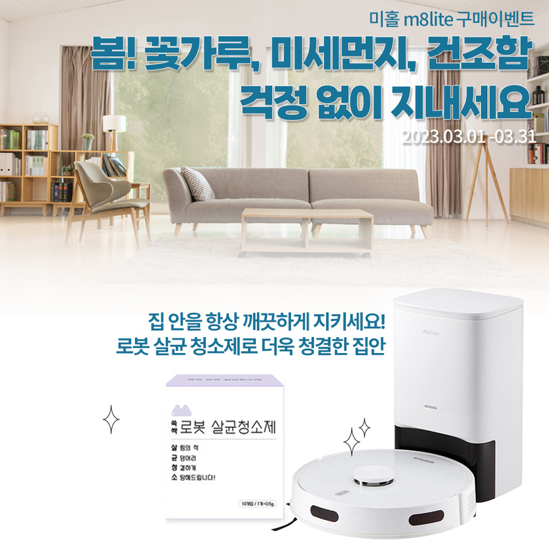 업체 관계자는 “봄철 미세먼지 및 꽃가루 등은 실내에 떠다니며 바닥에 가라앉길 반복하기 때문에 환기 후 수시로 물걸레 청소를 통해 바닥 청결을 유지하는 것이 중요하다”며 “미홀 M8 lite 로봇청소기는 진공 청소와 물걸레질을 동시에 할 수 있는 멀티 청소 기능이 있어 봄철 실내 청결 및 건조함까지 한 번에 해결할 수 있다”고 전했다.