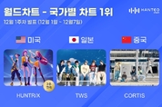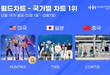 그룹 헌트릭스(HUNTR/X)와 투어스(TWS), 코르티스(CORTIS)가 한터 국가별 차트 각 부문 1위에 올랐다. 실시간 음악차트인 한터차트는 12일 발표한 12월 1주 차(집계 기간 1~7일) 미국, 일본, 중국 국가별 차트 TOP 30에 따르면 헌트릭스와 투어스 그리고 코르티스가 1위에 이름을 올렸다. 미국 부문에서는 헌트릭스의 'Golden'이 종합 지수 3만 474.36점으로 2주 연속 1위의 자리를 지켰다. 다음으로 스트레이 키즈의 'SKZ IT TAPE 'DO IT''(2만 3157.42점)이 2위, 키의 'HUNTER'(종합 지수 1만210.27점)가 3위에 자리했다. 일본 부문에서는 투어스의 'play hard'가 1위를 차지했다. 투어스 'play hard'의 종합 지수는 1만 1241.64점이다. 다음으로 2위는 트레저의 'LOVE PULSE'(9064.00점), 3위는 HANA의 'Blue Jeans'(8883.69점)이다. 중국 부문에서는 코르티스의 'COLOR OUTSIDE THE LINES'(2만 1526.43점)가 정상에 올랐다. 이어 태연의 'Panorama : The Best of TAEYEON'(2만 1135.25점)이 2