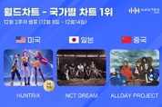 그룹 헌트릭스와 NCT 드림, 올데이 프로젝트가 한터 국가별 차트에서 뜨거운 인기를 입증했다. 실시간 음악차트인 한터차트가 19일 발표한 12월 2주 차(8~14일) 미국, 일본, 중국 국가별 차트 TOP 30에 따르면 헌트릭스(HUNTR/X)와 엔시티 드림(NCT DREAM), 올데이 프로젝트(ALLDAY PROJECT)가 각 부문 1위에 올랐다. 미국 부문에서는 헌트릭스의 'Golden'이 종합 지수 2만 5742.41점으로 3주 연속 정상을 지켰다. 다음으로 스트레이 키즈의 'SKZ IT TAPE 'DO IT''(1만 6256.07점)이 2위, 코르티스의 'COLOR OUTSIDE THE LINES'(8917.73점)가 3위에 자리했다. 일본 부문에서는 NCT 드림의 'Beat It Up'이 1위를 차지했다. NCT 드림 'Beat It Up'의 종합 지수는 1만 1365.11점이다. 다음으로 2위는 웨이션브이의 '白色定格(Eternal White)'(8659.75점), 3위는 있지의 'TUNNEL VISION'(8153.67점)였다. 중국 부문에서는 올데이 프로젝트의 'ALLDAY PROJECT'(1만 9667.20점)가 정상에 올랐다. 이어 코르티스